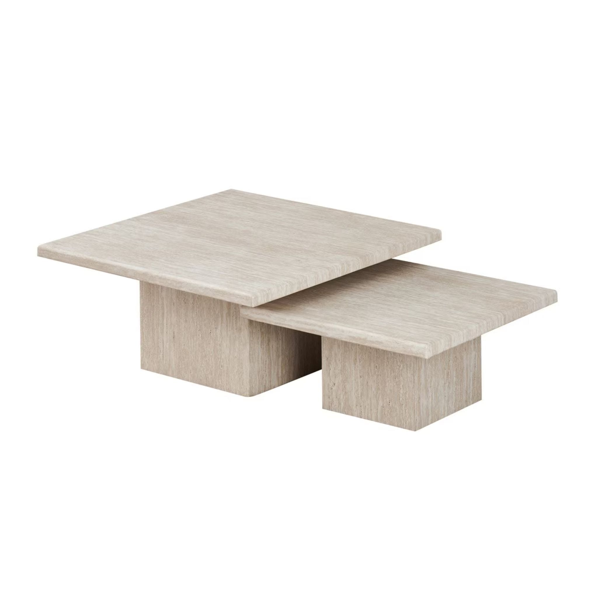 Beige travertine nesting tables on a white background