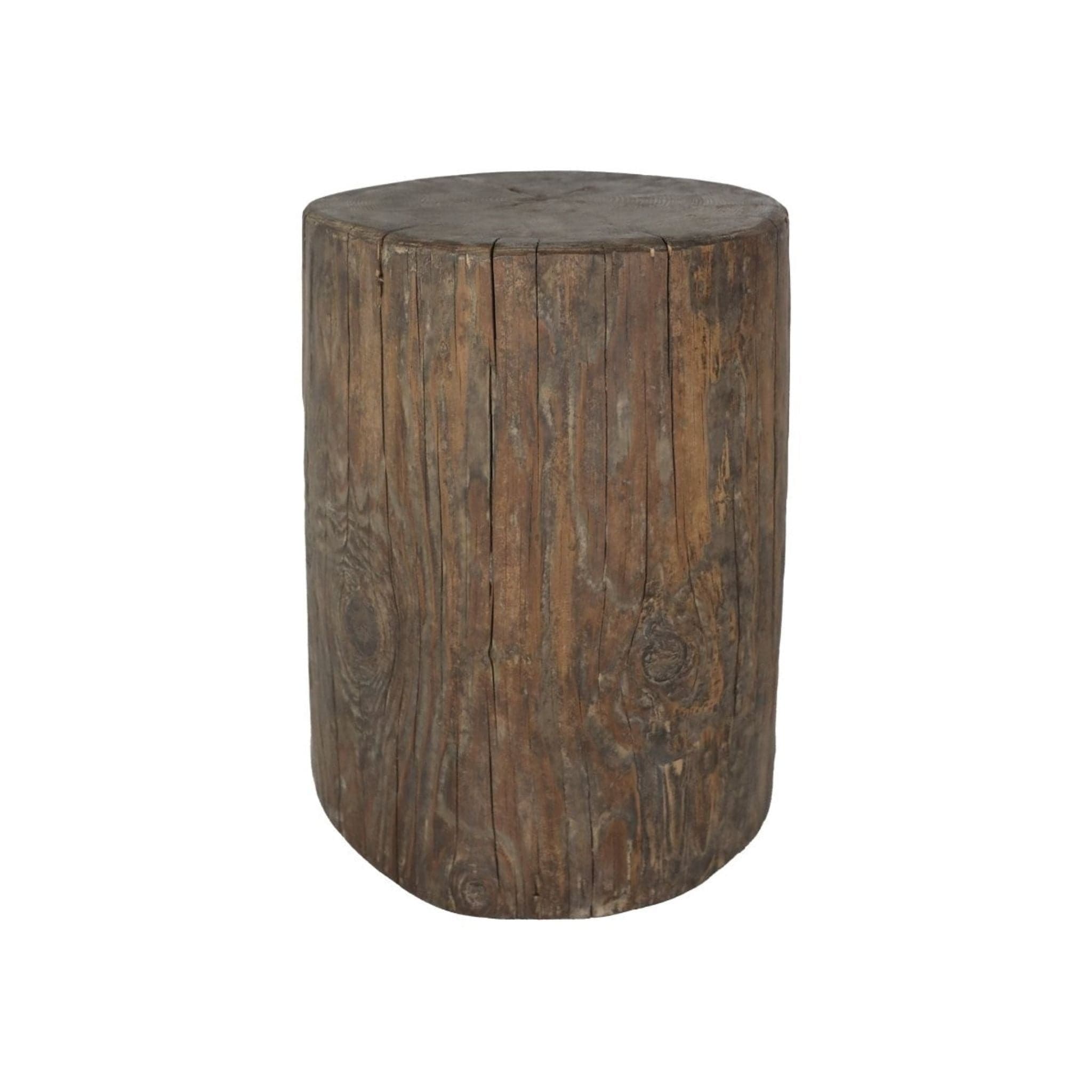 Solid and cylindrical in form, the piece celebrates the raw character of reclaimed elm, with visible knots and natural markings throughout. Its compact proportions allow it to function effortlessly as a side table or occasional stool. The waxed finish softens the surface while preserving the honesty and depth of the material.