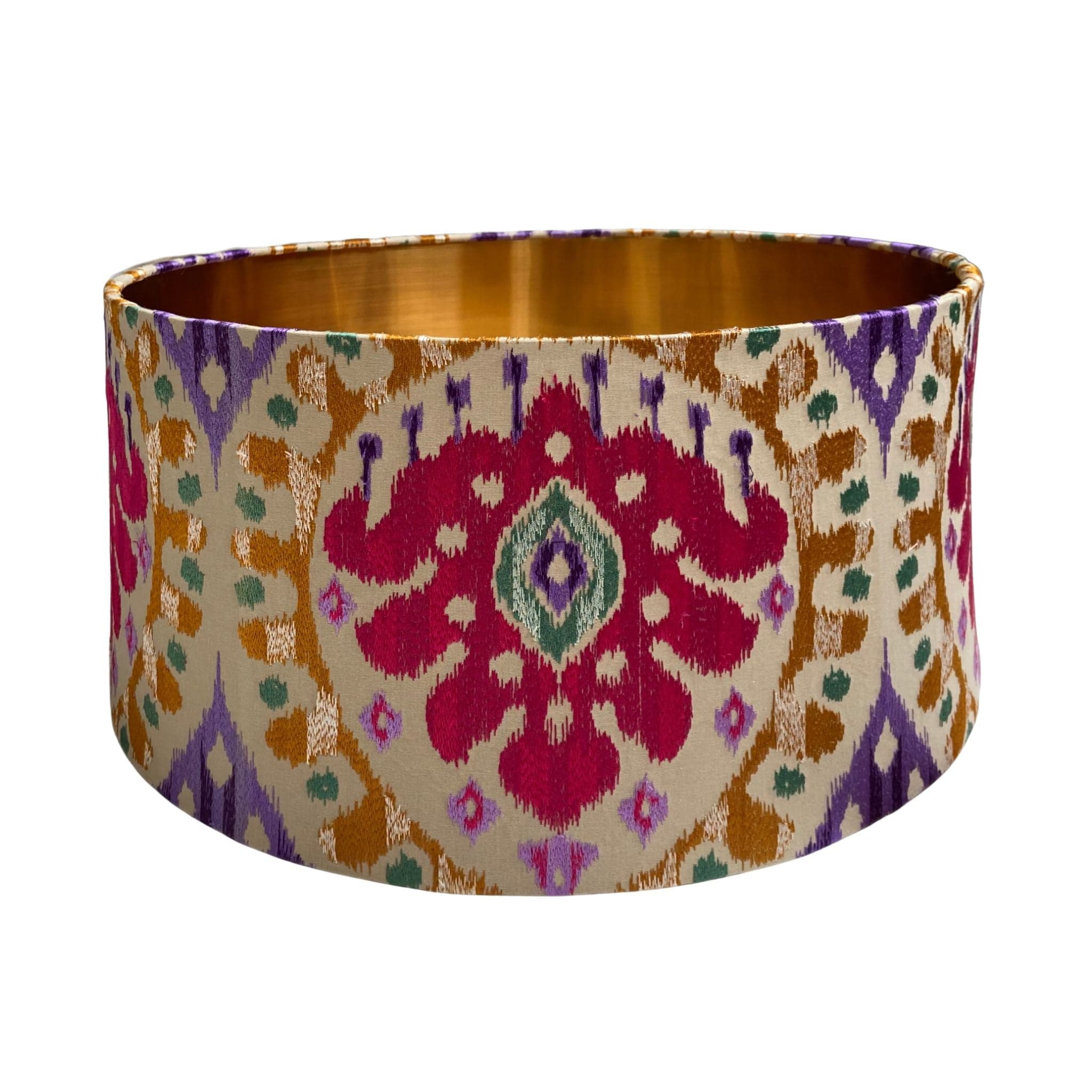 The Embroidered Ikat Drum Lampshade features a richly detailed jacquard ikat design embroidered across a natural cotton base cloth. Soft pink tones are layered with accents of gold and deep purple, creating a decorative pattern that feels both vibrant and refined.