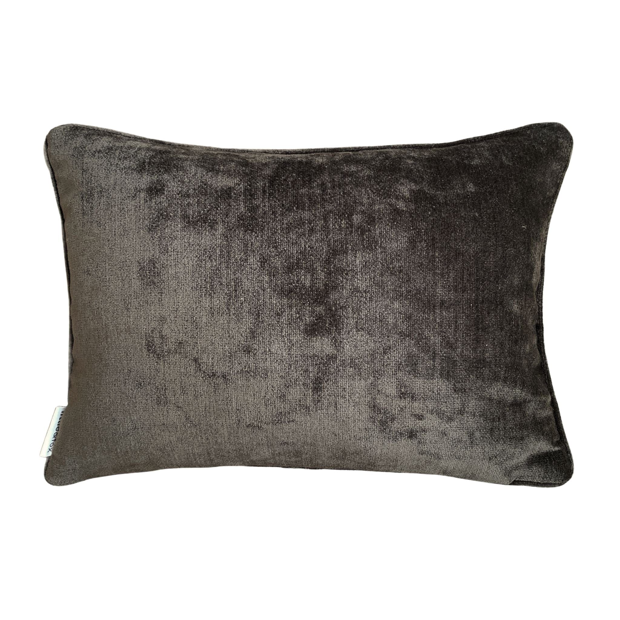Backed and piped in brown textured velvet, the contrast edging enhances the depth of the olive tone while introducing a tailored finish. Compact in size, it layers beautifully with larger cushions or works as an accent on occasional chairs and beds.